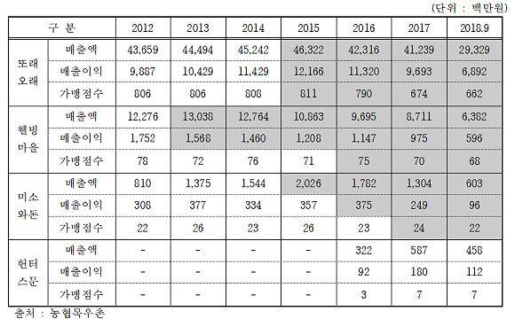 또 다른 브랜드인 웰빙마을과 미소와돈 역시 각각 2014년과 2015년을 기점으로 매출액 및 가맹점 수가 가파르게 하락하는 등, 서민들이 직접적으로 타격을 입을 수 있는 가맹사업 운영이 부실한 것으로 드러났다.