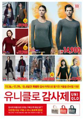 [프라임경제] 유니클로는 16일부터 19일까지 4일간 고객들의 사랑과 성원에 보답하는 의미를 담아 진행되는 '유니클로 감사제' 할인 품목을 공개한다고 15일 밝혔다.