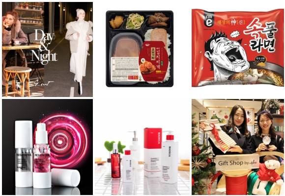 (왼쪽부터 시계방향) 지컷 퍼 컬렉션데이 & 나잇, 세븐일레븐 오모가리 돼지김치찌개 도시락·두부 강된장찌개 도시락, 이마트24 속풀라면 봉지면 출시, 갤러리아백화점 크리스마스 기프트 아틀리에 매장 오픈, 센텔리안24 마테카 헤어로스 테라피 삼푸&토닉, 일동제약 레스베라트롤 앰플. ⓒ 각 사