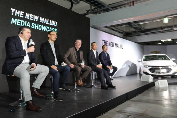 왼쪽부터 카허카젬 한국GM 사장, 신영식 한국GM 부사장 겸 CMO, 제임스 플레밍 디자인 부문 전무, 차량구동시스템부문 황준하 전무, 한국GM 기술연구소 박해인 부장이 미디어의 질의에 응답하고 있는 모습. ⓒ 한국GM