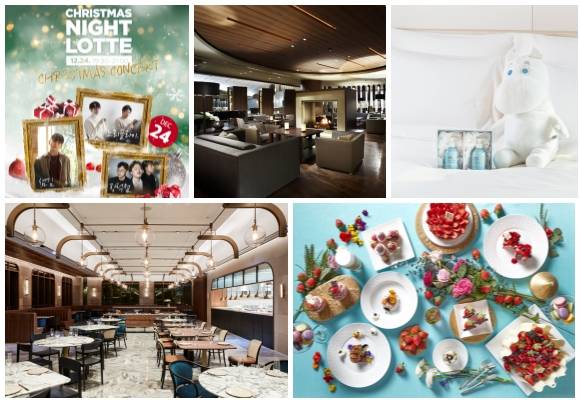 (왼쪽부터 시계방향) 롯데호텔서울 크리스마스 나이트 롯데, 서울신라호텔 디너 콘서트·메리 윈터 위드 무민 패키지, 워커힐 딸기 뷔페 베리베리 스트로베리, 해비치 아메리칸 레스토랑 마이클 바이 해비치 오픈. ⓒ 각 사