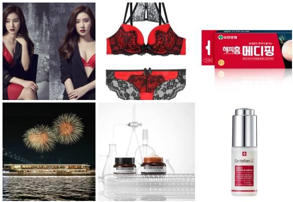 (왼쪽부터 시계방향) BYC 쎌핑크 크리스마스 커플 란제리, 좋은사람들 크리스마스 언더웨어 컬렉션, 유한양행 해피홈 메디핑, 센텔리안24 마데카 부스팅 오일 앰플, 퍼스트랩 프로바이오틱 리버스 시리즈, 이랜드크루즈 크리스마스 크루즈. ⓒ 각 사