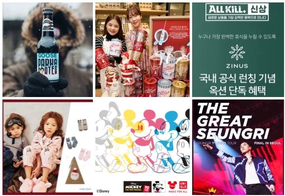 (왼쪽부터 시계방향) 구스아일랜드 구스 파카 포터, 윌리엄스 소노마 핫초코 5종, 옥션 지누스 공식 론칭·빅뱅의 승리 솔로 콘서트 티켓 판매, 유니클로 셀러브레이트 미키, 한세드림 컬리수 수면양말 4종. ⓒ 각 사