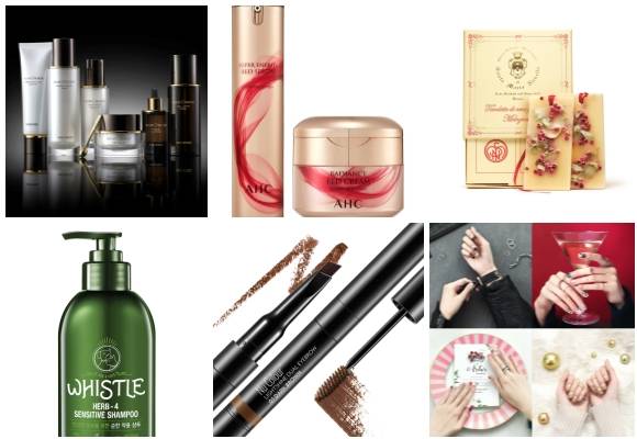 (왼쪽부터 시계방향) 비디비치 뉴오더, AHC 슈퍼 에너지 레드 세럼 & 래디언스 레드 크림 시그니처 에디션, 바이레도 미니 캔들 세트 2종, 네이처리퍼블릭 컬러앤네이처 글리터피아 젤네일 스트립 6종, 뉴스킨 라이트샤인 듀얼 아이브로우, 애경산업 휘슬 라이트샤인 듀얼 아이브로우. ⓒ 각 사