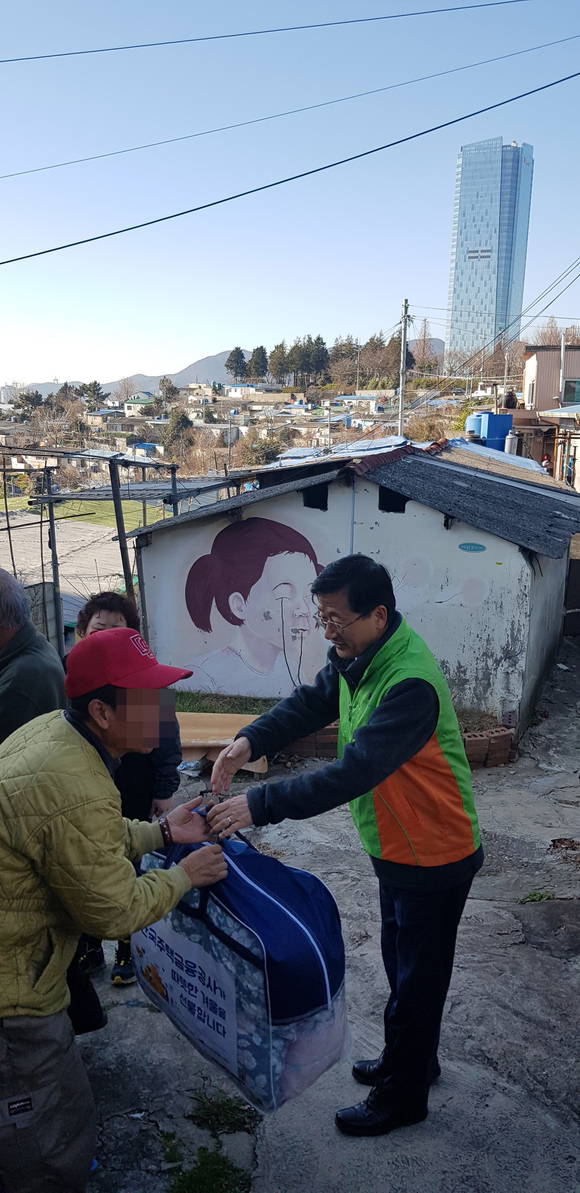 지난 13일 이곳을 주금공 신입 연수생 수십명이 찾았다. 그들의 직장인 부산 문현금융단지 BIFC빌딩이 바로 내려다보이는 이곳에서 사회공헌활동을 펼친 것. 이날 이들이 준비한 기부물품은 겨울나기에 제격인 극세사로 짠 이불담요. 동장군도 두렵지 않을 만큼 따뜻해 보인다. 이뿐만이 아니다. 이불이 든 가방 속에는 쑤시고 저리린데 용이하게 사용될 파스가 한통씩 담겨져 있다. 선물을 받아든 주민들도 매우 흡족해한다. 어르신들이 많은 주민들을 위한 공사 측에 센스와 세심한 배려가 엿보이는 대목이다.