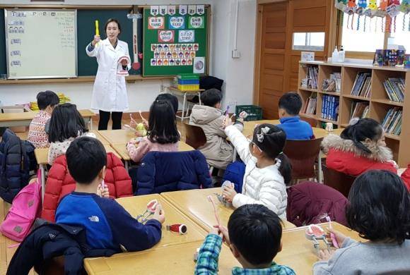 오랄-비의 칫솔 재활용 프로그램 및 구강관리 교육에 참여한 초등학생들이 양치법을 배우고 있다. ⓒ 한국P&G