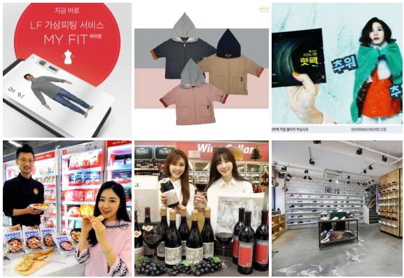 (왼쪽부터 시계방향) LF 마이핏 론칭, 한세드림 간절기 패딩 점퍼·조끼 신제품 출시, GS샵 오늘의 선택 프로그램 신설, ABC마트 온더스팟 한남점 오픈, 이마트 아트 앤 와인 3종, 홈플러스 올어바웃푸드 감바스 알 아히요. ⓒ 각 사