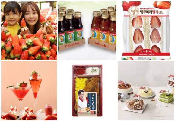 (왼쪽부터 시계방향) 롯데마트 킹스베리 딸기·로트벡쉔, 이마트24 땡큐베리 딸기샌드, 세븐일레븐 크리스마스 케이크·3색치킨덮밥, 롯데호텔 2019 머스트 비 스트로베리 프로모션. ⓒ 각 사