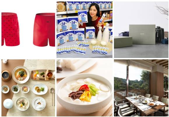 (왼쪽부터 시계방향) BYC 돼지의 해 맞이 남성용 레드 박서 2종, 홈플러스 남양 3.4 우유맛 스틱 판매, 롯데호텔 2019년 설 선물 세트, 신라호텔 투 나이츠 패키지, 신라스테이 떡국 한상 차림 복 한가득 패키지, 워커힐 새해 맞이 레스토랑 프로모션. ⓒ 각 사