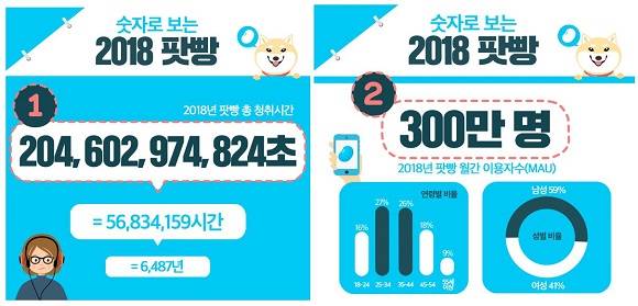 2018년 한 해 동안 팟빵에서 발생한 총 청취시간은 2046억297만4824초다. 이를 시간으로 환산하면 5683만4159시간, 연으로 환산하면 6487년에 달한다. 팟빵의 월간 활성 이용자(MAU) 수는 300만명 이상으로, 단순 평균으로만 계산해도 이용자 한 명당 연 20시간 가량의 청취가 발생한 셈이다.