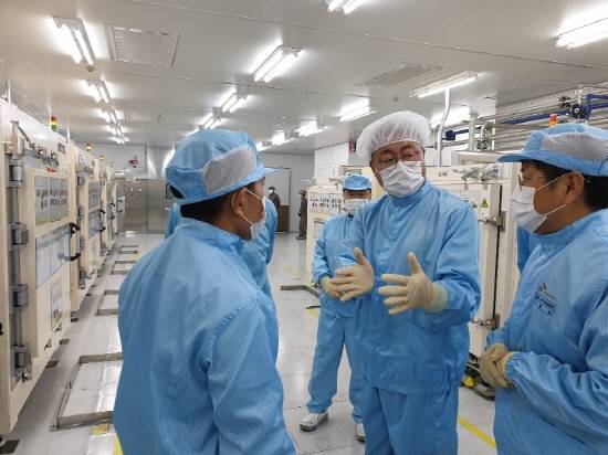 김준 SK이노베이션 사장이 1일 배터리 서산 공장을 방문해 현장을 둘러보고 있다. ⓒ SK이노베이션