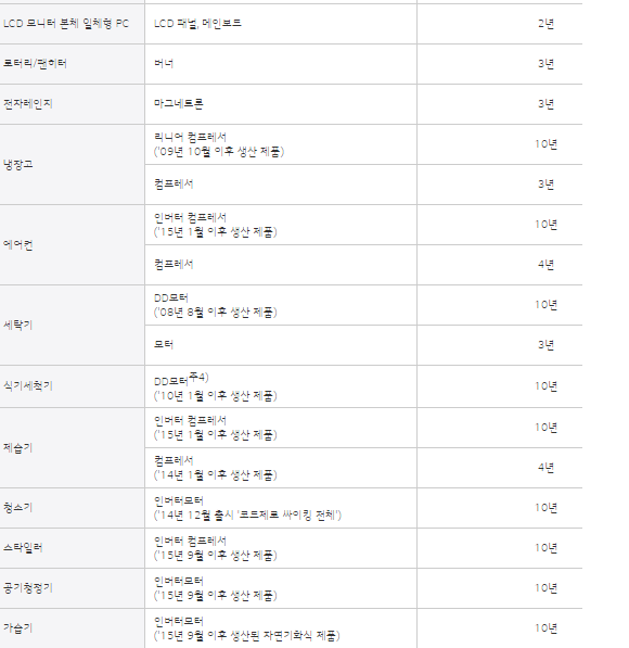 LG전자는 이와 별도로 제품별 2~4년의 자체 부품 품질보증 기간을 정해두고 있다. 단 △리니어 및 인버터 컴프레서 △DD 및 인버터 모터 △인버터 마그네트론 등 핵심부품은 10년간 품질 보증하기로 했다.
