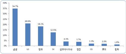다음으로는 금호 아시아나(4.3%)가 5위에 올랐고, 6위 이하로는 한진(3.7%), GS(2.2%), 롯데(2.0%) 한화(1.4%)가 뒤를 이었다.