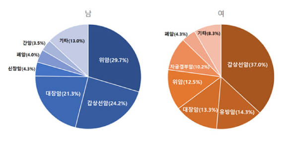 남성은 위암이 29.7%(251명)로 가장 많았고, 이어 △갑상선암 24.2%(205명) △대장암 21.3%(180명) △신장암 4.3%(36명) △폐암 4.0%(34명) △간암 3.5%(30명) 순이었다.