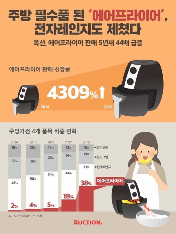 옥션은 최근 5년간(2014년~2018년) 튀김·구이·데우기 기능을 갖춘 대표 주방가전 △에어프라이어 △전자레인지 △전기오븐 △전기그릴 등 4개 품목의 판매량을 분석한 결과 이 같이 나타났다고 21일 밝혔다.