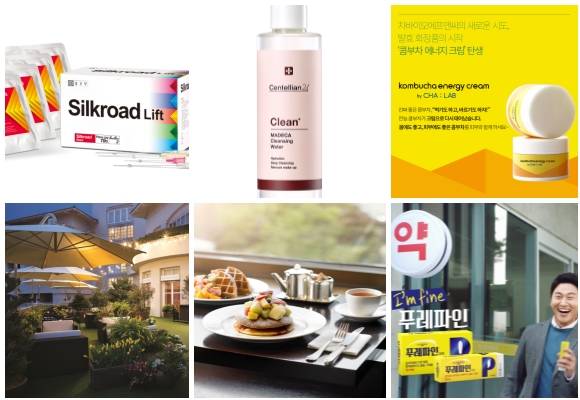 (왼쪽부터 시계방향) 종근당 실크로드 5종, 센텔리안24 마데카 클렌징 워터, 차바이오F&C 콤부차 에너지 크림 by CHA:LAB, 일동제약 푸레파베인 캡슐, 서울신라호텔 스프링 고메 패키지, 제주신라호텔 플라워 테라스 가든. ⓒ 각 사