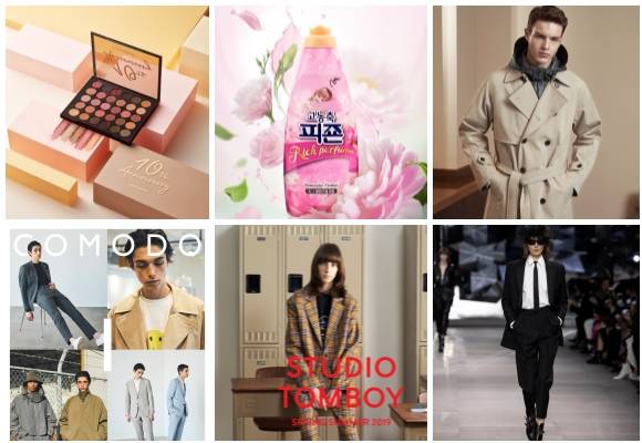 (왼쪽부터 시계방향) 네이처리퍼블릭 프로 터치 컬러 마스터 섀도 팔레트-엑스 에디션, 피죤 고농축 피죤 리치퍼퓸, 알레그리 스프링 코트 컬렉션, 셀린느 2019년 봄·여름 컬렉션을 출시, 스튜디오 톰보이 뉴트로 트렌드 반영 봄·여름 시즌 컬렉션, 코모도 2019년 봄·여름 시즌 신규 컬렉션. ⓒ 각 사