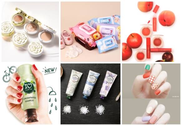 (왼쪽부터 시계방향) 오휘 얼티밋 브라이트닝 라인, LG생활건강 베비언스 ONLY 7, 어퓨 과즙팡 무스 틴트, 이니스프리 매직프레스 10종, 애경산업 솔트 덴탈케어 브랜드 살라리움, 이브로쉐 소용량 샴푸 컨센트레이티드 샴푸 올 헤어 타입. ⓒ 각 사