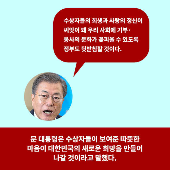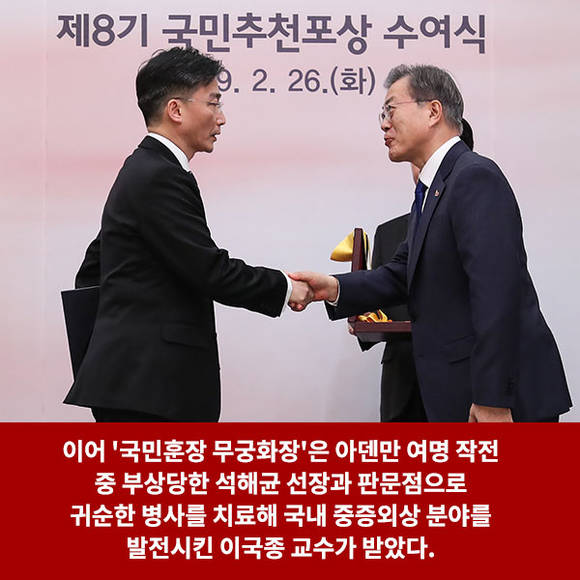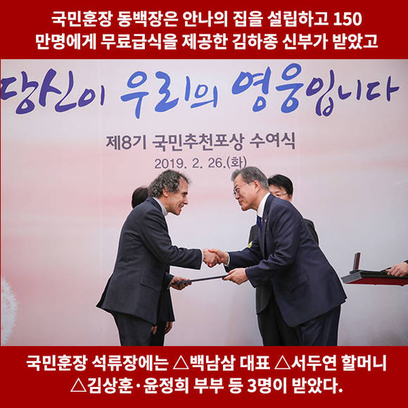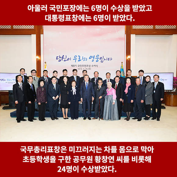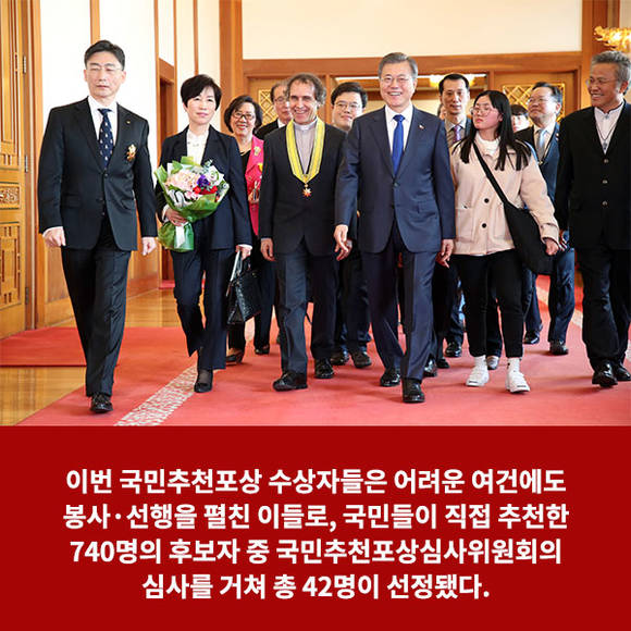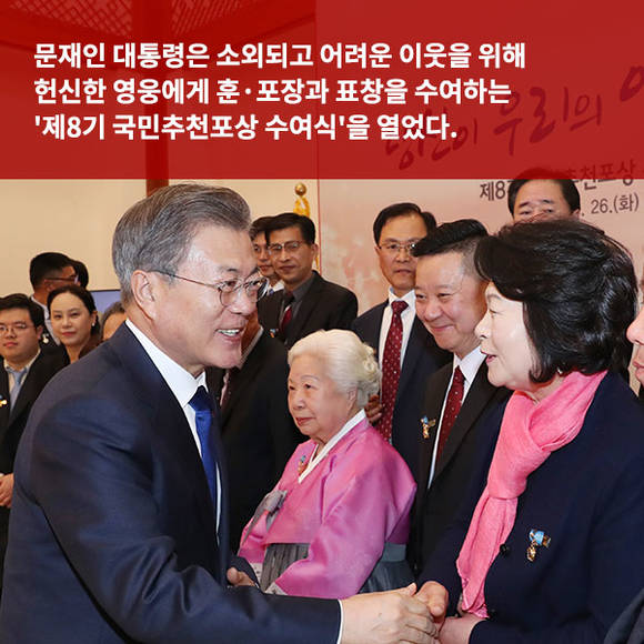 [프라임경제] 문재인 대통령은 소외되고 어려운 이웃을 위해 헌신한 영웅에게 훈·포장과 표창을 수여하는 '제8기 국민추천포상 수여식'을 열었다.