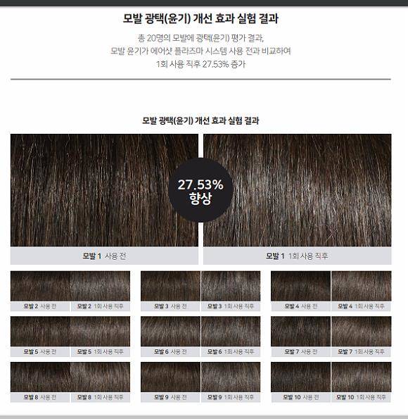 한국피부과학연구원이 진행한 에어샷 플라즈마 시스템의 모발 광택 개선효과 실험에서는 1회 사용 직후 27.53%가 모발 광택이 증가됐다. ⓒ 유닉스전자