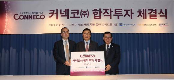 앰배서더호텔그룹은 카카오인베스트먼트, 프리미엄패스인터내셔널과 국내 최초 종합 마이스 플랫폼 비즈니스 기업 커넥코 합작투자 체결식을 진행하고 21일 정식 출범했다. (왼쪽부터) 박지환 카카오인베스트먼트 대표, 변보경 커넥코 대표, 김응수 프리미엄패스인터내셔널 대표. ⓒ 앰배서더호텔그룹