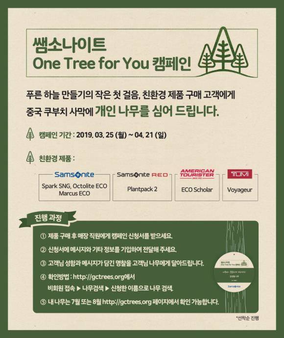 4월21일까지 쌤소나이트, 쌤소나이트 레드와 아메리칸 투어리스터, 투미 등 4개 브랜드의 친환경 소재로 만든 6개 제품 라인 중 하나를 구입하는 고객 1000명을 대상으로 고객 이름과 메시지를 담은 개인 나무를 중국 쿠부치 사막에 심어줄 예정이다.