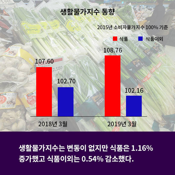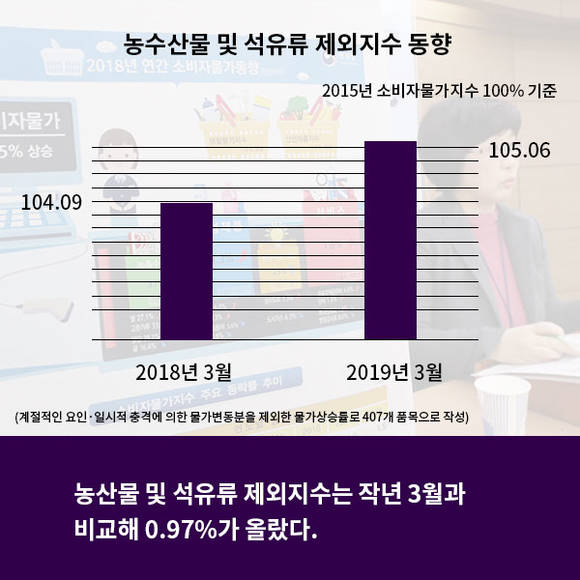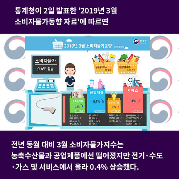 [프라임경제] '2019년 3월 소비자물가동향 자료'에 따르면 전년 동월 대비 3월 소비자물가지수는 농축수산물과 공업제품에선 떨어졌지만 전기·수도·가스 및 서비스에서 올라 0.4% 상승했다.