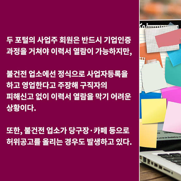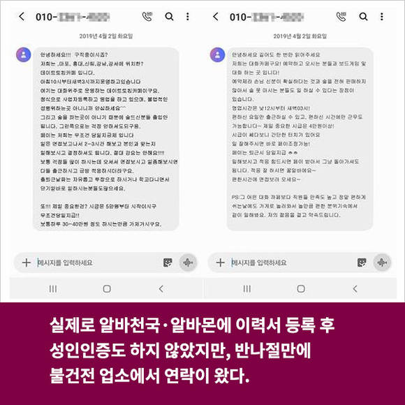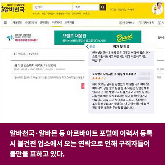 [프라임경제] 알바천국·알바몬 등 아르바이트 포털에 이력서 등록 시 불건전 업소에서 오는 연락으로 인해 구직자들이 불만을 표하고 있다.