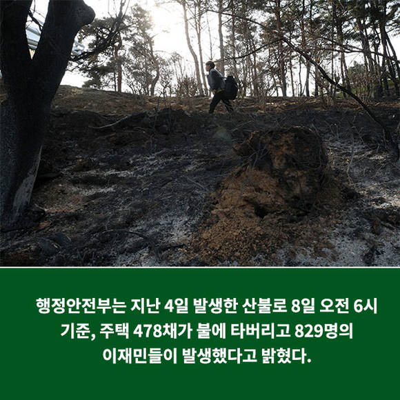 [프라임경제] 행정안전부 중앙재난안전대책본부는 지난 4일 발생한 산불로 주택 478채가 불에 타버리고 829명의 이재민들이 발생했다고 밝혔다.