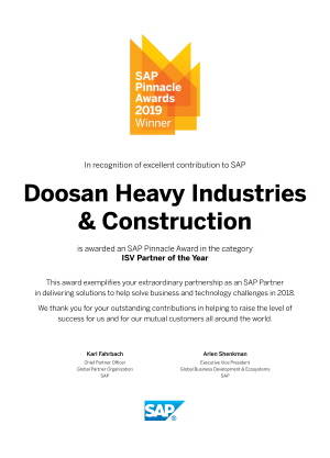 두산중공업이 수상한 SAP 피나클어워드 '2019 올해 ISV 파트너 인증서'. ⓒ 두산중공업