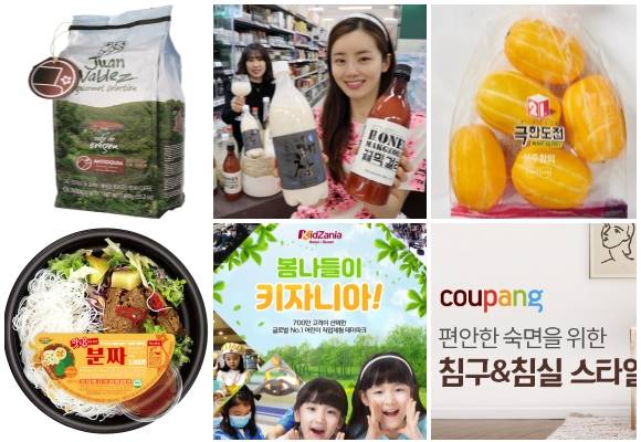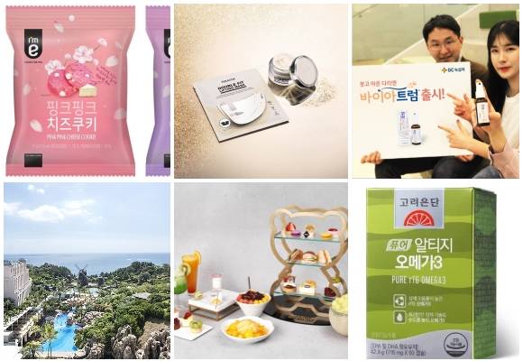 (왼쪽부터 시계방향) 이마트24 컬러쿠키 2종, 테라톡스 더블 핏 리프팅 마스크, GC녹십자 바이아트럼, 고려은단 퓨어 알티지 오메가3, 롯데호텔서울·모스키노 콜라보레이션 빙수 프로모션, 롯데호텔제주 엄마는 소녀 패키지. ⓒ 각 사