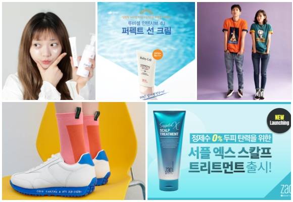 (왼쪽부터 시계방향) 멘소래담 아이스킨케어 신제품 메시루, 루비셀 인텐시브 4U 퍼펙트 선 크림, 디자인 유나이티드 캐릭터 협업 티셔츠, 자올 닥터스오더 서플 엑스 스칼프 트리트먼트, 질스튜어트스포츠 코코 카피탄 협업 슈즈 컬렉션. ⓒ 각 사