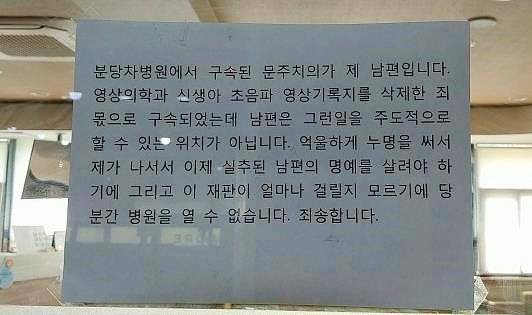문 씨의 아내는 "분당차병원에서 구속된 문 주치의가 내 남편"이라며 "영상의학과 신생아 초음파 영상기록지를 삭제한 죄 몫으로 구속됐는데 남편은 그런 일을 주도적으로 할 수 있는 위치가 아니다"고 했다.
