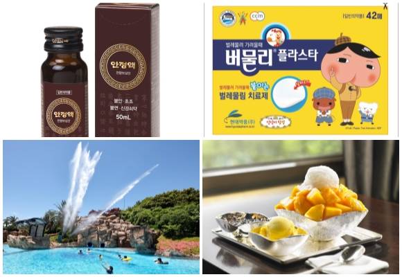 (왼쪽부터 시계방향) 삼진제약 안정액 패키지 리뉴얼, 현대약품·엉덩이 탐정 콜라보레이션 패키지, 서울신라호텔 애플망고 빙수, 롯데제주호텔 레이지 모멘트 패키지. ⓒ 각 사