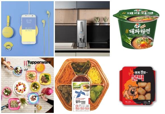 (왼쪽부터 시계방향) 다이소 레몬톡톡 시리즈, 현대렌탈케어 큐밍 더슬림 히든케어 직수형 냉온정수기, 세븐일레븐 세븐셀렉트 대파라면·이게정말불떡, 이마트24 열무비빔밥·열무비빔국수, 타파웨어 조이 홈파티 세트. ⓒ 각 사
