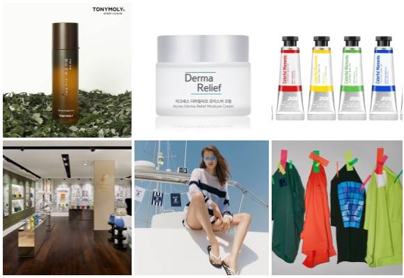 (왼쪽부터 시계방향) 토니모리 프롬 강화 맑은 약쑥, 아크네스 더마 릴리프 모이스처 크림, 애경산업 2080 팔레트 치약, LF TNGT·3M 협업 상품 출시, 보브·베스파 콜라보레이션 컬렉션, 폰타나 밀라노 1915 신규 매장 오픈. ⓒ 각 사