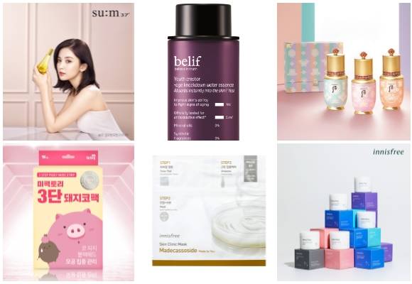 (왼쪽부터 시계방향) 숨37 숨마 에센스 절정의 빛 에디션, 빌리프 유쓰 크리에이터-에이지 넉다운 워터 에센스, 후 비첩 예찬 세트, 이니스프리 퍼스널 원크림·메이드바이유, 에이블씨엔씨 미팩토리 홈쇼핑 방송. ⓒ 각 사
