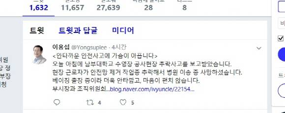 이용섭 광주광역시장이 안타까운 수영장 현장 사고와 관련, 출장 중임에도 이례적으로 빠른 조의 표명을 하고 나섰다. ⓒ 이용섭 트위터