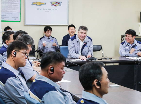 카허 카젬 사장이 창원공장 현장을 방문해 직원들을 격려하고 상호간 자유롭게 소통하는 모습. ⓒ 한국GM