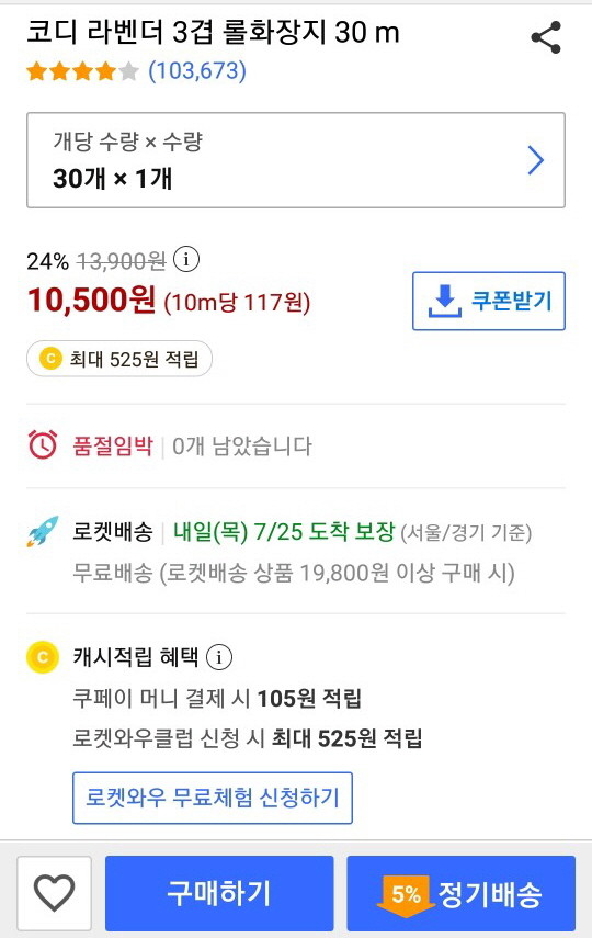 실제 현재 쿠팡에서 상품을 클릭하면 '품절임박' 0개 남았습니다"라고 표시되고 구매를 클릭하면 "주문 중 오류가 발생했습니다. 다시 시도해 주세요"라고 뜬다. 사실상 주문이 불가능한 상태다.