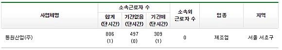 올해 기준 소속 근로자가 814명에 달하는 동원산업은 지난해 고용형태 공시에 소속 외 근로자를 0명으로 표기해 올해 3월 기준 비정규직 근로자가 큰 폭으로 상승했다.