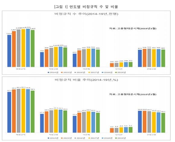 보고서에 따르면 고용형태 공시제 시행 첫해인 2014년에 162만명(37.3%)이던 비정규직이 2017년에는 192만명(40.3%)으로 30만명(3.0%p) 증가했다. 하지만 2018년에는 194만명(49.8%)으로 수는 증가하고 비율은 감소했으며, 2019년에는 187만명(38.5%)으로 수와 비율 모두 감소했다.