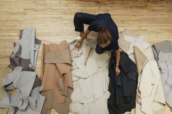 패션 디자이너 마리아 코르네호가 의상 제작에 사용할 자동차 시트 폐가죽을 고르고 있는 모습. ⓒ 현대자동차