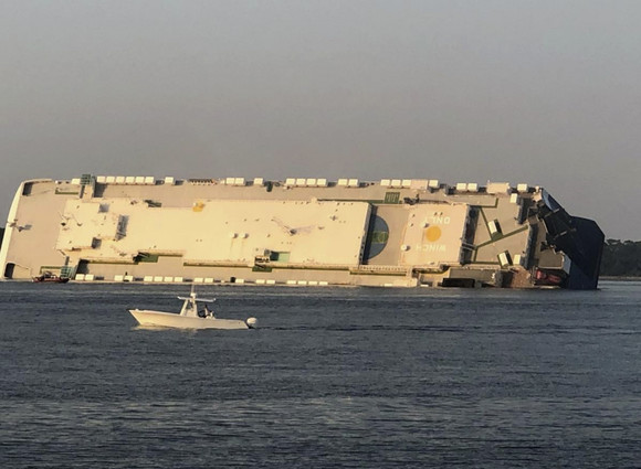 현대글로비스 소속 자동차 운반선 골든레이호가 8일(현지시간) 미국 조지아주 브런즈윅항 인근 바다에서 전도돼 옆으로 기울어져 있다. ⓒ 연합뉴스