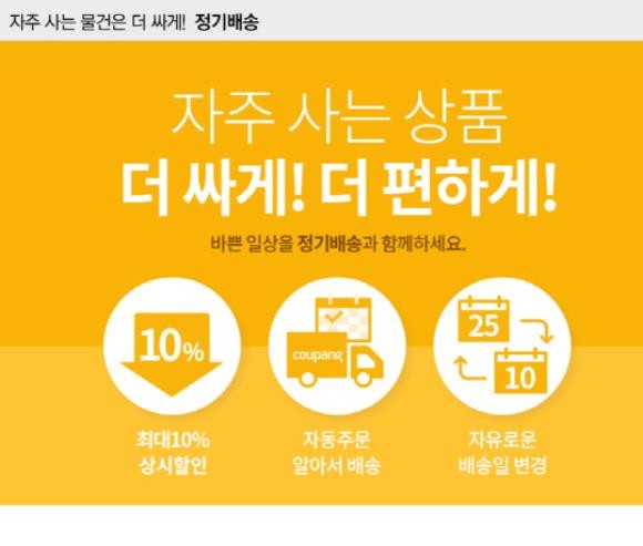 식품업계에 따르면 쿠팡은 홈페이지 내에서 정기배송 카테고리를 운영하며 1000여가지 상품의 정기배송 서비스를 지원하고 있다. 생수와 기저귀, 분유, 물티슈 등 생필품부터 반려동물용품과 다이어트식품까지 정기배송이 가능하다.