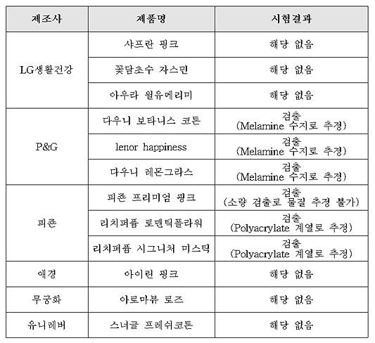 조사대상 가운데 △LG생활건강 샤프란 핑크, 꽃담초수 자스민, 아우라 윌유메리미 등 3개 제품 △애경 아이린 핑크 △무궁화 아로마뷰 로즈 △유니레버 스너글 프레쉬코튼 등 나머지 6개 제품에서는 잔류물이 검출되지 않았다.