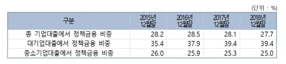 정재호 더불어민주당 의원(경기고양을, 정무위원회)이 금융감독원에게 받은 '국내 기업의 정책금융 비중 현황'에 따르면, 국내 기업 전체 여신액에서 정책금융(산은·기은) 비중이 2015년 28.2%에서 2018년 27.7%로 감소했다.