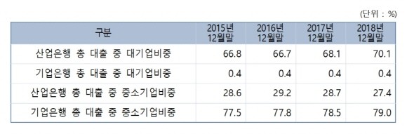 국내은행과 기업은행 중소기업 여신은 2015년 이후 비중이 지속 증가하고 있는 가운데, 산업은행은 2015년 말 28.6%에 달하던 중소기업 대출 비중을 줄여 2018년 말 27.4%로 비중이 1.2%pt 감소했다.