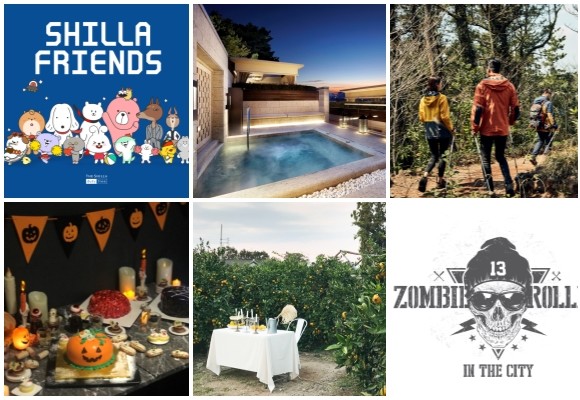 (왼쪽부터 시계방향) 신라면세점 신라프렌즈, 서울신라호텔 하트 워밍 패키지, 제주신라호텔 내추럴 트레킹, 롯데시티호텔 좀비 롤러 인 더 시티, 메종 글래드 제주 아날로그 제주 패키지, 글래드호텔 핼러윈 데이 프로모션. ⓒ 각 사