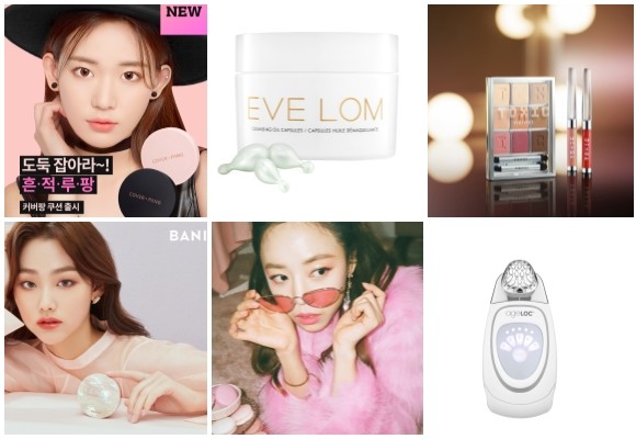 (왼쪽부터 시계방향) 어퓨 커버팡 쿠션 2종, 라페르바 이브롬 클렌징 오일 캡슐, 비디비치-이시야마 프렌치 협업 톡식 더 뮤트 컬렉션, 뉴스킨 에이지락 갈바닉 & 뉴트리올, 에이핑크 김남주 참여 퓨어띠어리 론칭, 바닐라코 커버리셔스 내추럴 글로우 쿠션. ⓒ 각 사